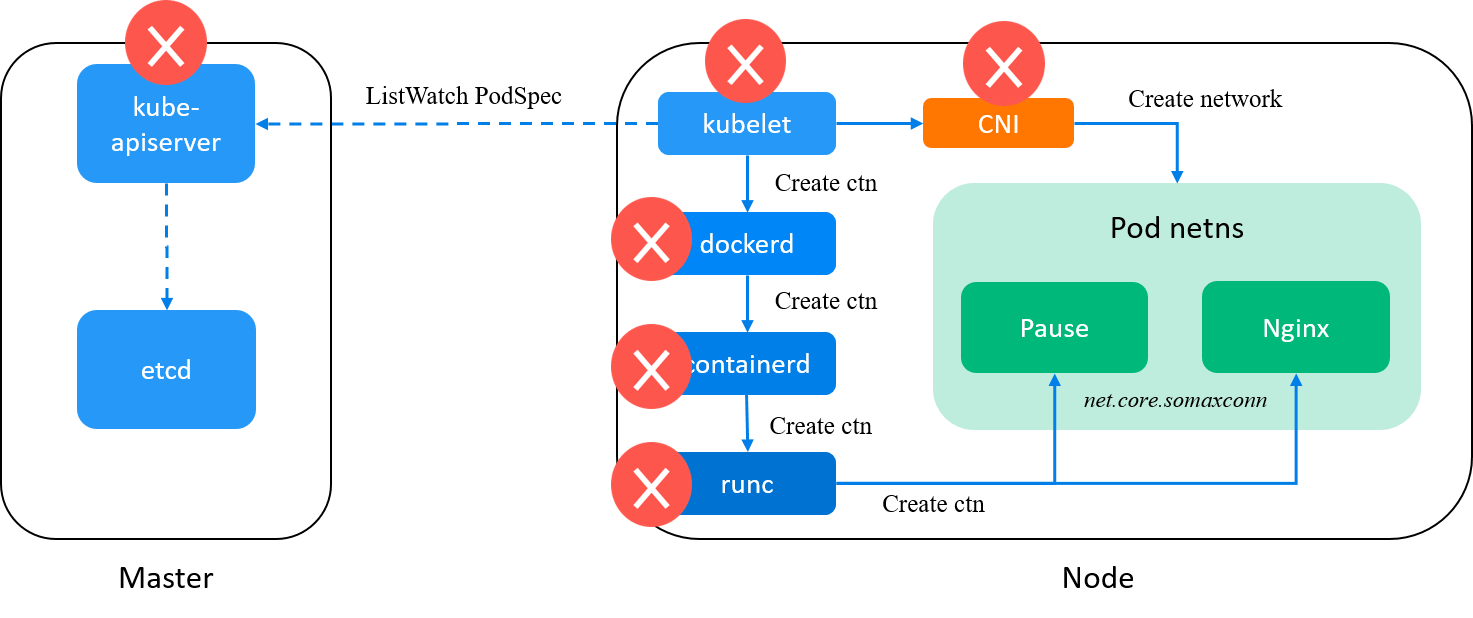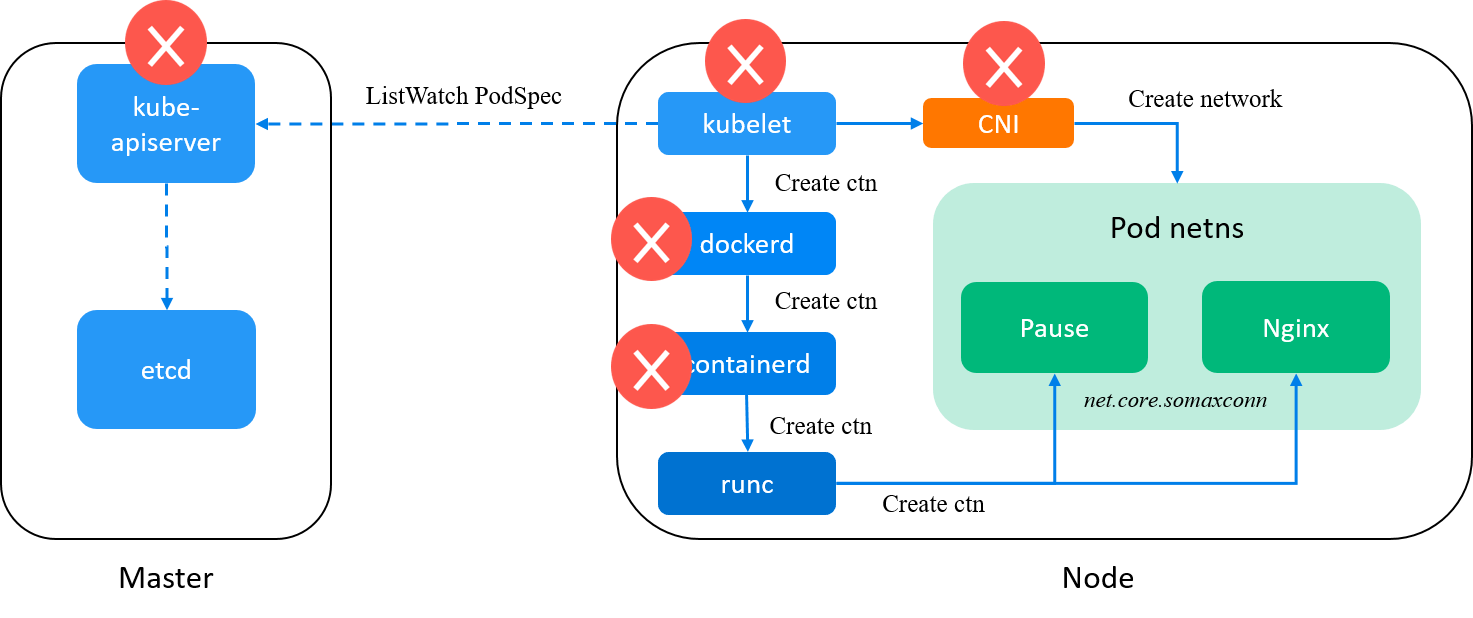 kubelet: watchkube-apiserver, on receiving a new Pod spec, calldockerdto create containers for the Pod (and later call CNI plugins to init pod network); -