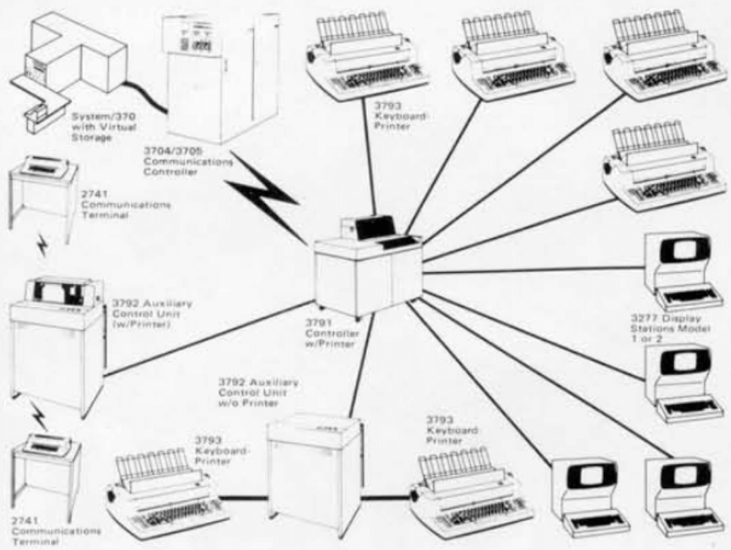 这是当时 IBM 新发布的网络架构,称为 SNA(Systems Network Architecture), 可以看到其中有很多打印机和终端,这就是当时所谓的网络。