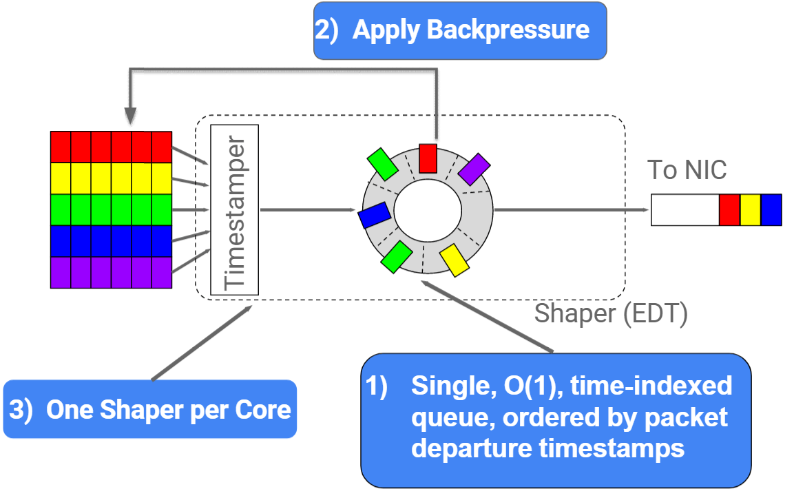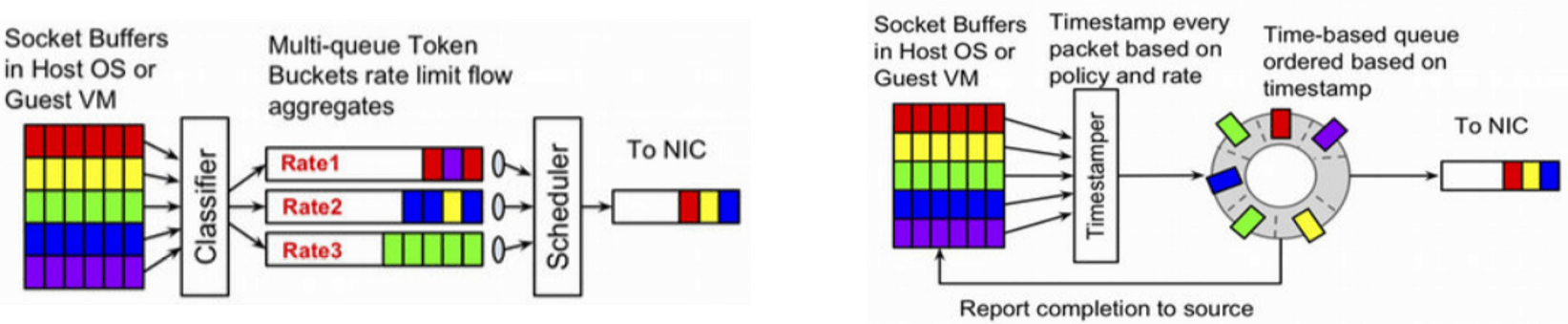 用一个时间轮调度器(timing-wheel scheduler)代替原来 网卡前或网卡中的发包缓冲队列(queue)。