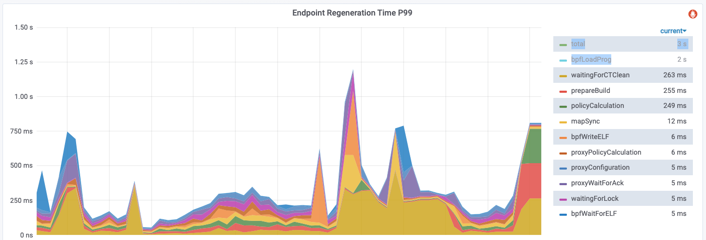 When a pod is created, a new identity might be allocated. On receiving an identity create event, all cilium-agents would regenerate BPF for all the pods on the node to respect the identity, which is a fairly heavy operation, as compiling and reloading BPF for just a single pod would take several seconds.