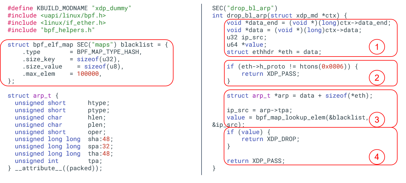 图 2.1. eBPF 代码示例:丢弃源 IP 命中黑名单的 ARP 包