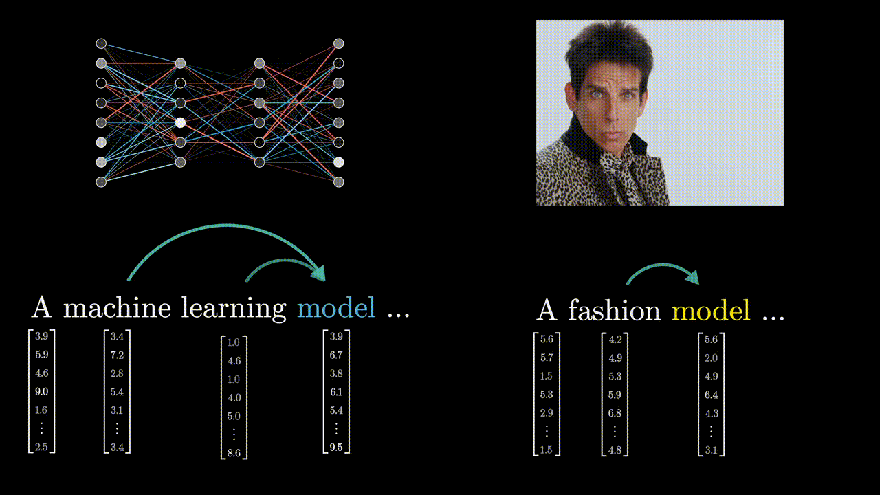 例如,“model” 这个词在 “machine learning model”(机器学习模型)和在 “fashion model”(时尚模特)中的意思就完全不一样, 因此虽然是同一个单词(token),但对应的 embedding 向量是不同的,