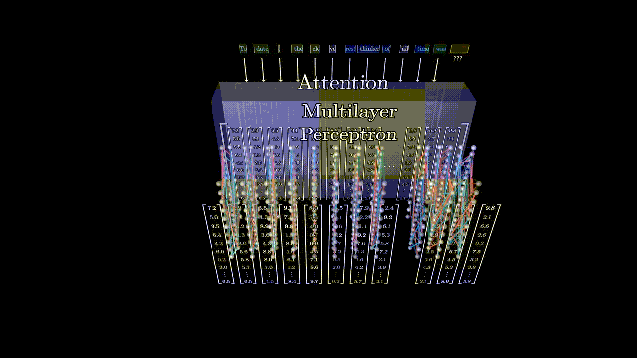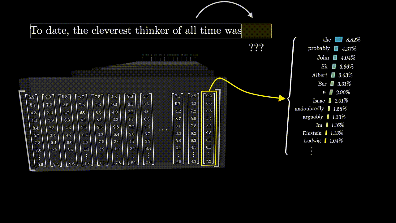 如果一切顺利,最后一层 feed-forward 输出中的最后一个向量(the very last vector in the sequence), 就已经包含了句子的核心意义(essential meaning of the passage)。对这个向量进行 unembedding 操作(也是一次性矩阵运算), 得到的就是下一个单词的备选列表及其概率: