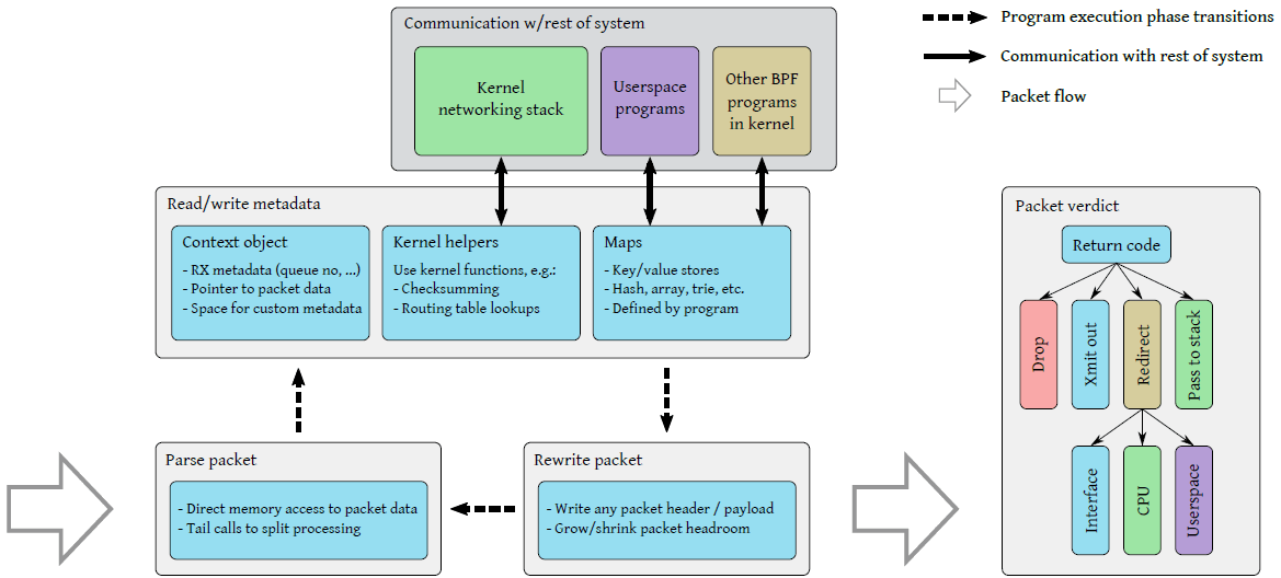 - XDP 定义了一个受限的执行环境(a limited execution environment),运行在一个 eBPF 指令虚拟机中。eBPF 是 BSD Packet Filter (BPF) [37] 的扩展。