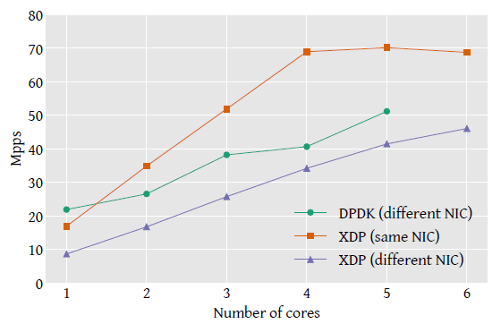 我们的测试结果显示 XDP 能取得 24Mpps/core 的处理性能,这虽然与 DPDK 还有差距,