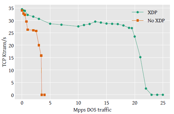 - 测试结果显示,XDP 能达到 24Mpps/core 的处理性能。